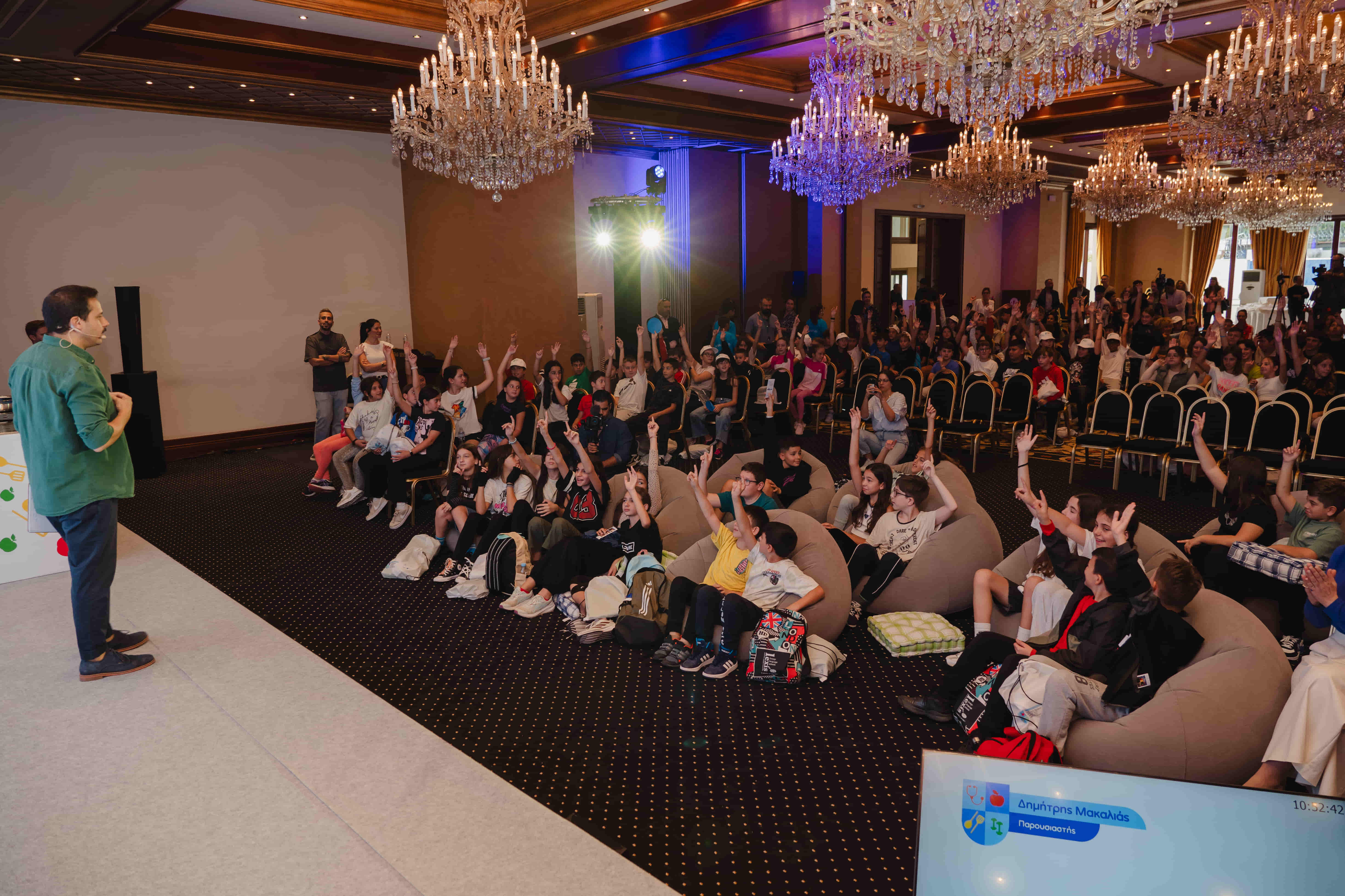 Τους μαθητές υποδέχτηκαν ο Δημήτρης Μακαλιάς και η Ελευθερία Μπενοβία, παρουσιάζοντας την Εθνική Δράση κατά της Παιδικής Παχυσαρκίας, ενώ ο σεφ Γιώργος Τσούλης ετοίμασε μαζί με τα παιδιά γευστικές και υγιεινές συνταγές. Παράλληλα, ο διαιτολόγος - διατροφολόγος Χρήστος Δερδεμέζης μοιράστηκε έξυπνες συμβουλές για μια πιο ισορροπημένη διατροφή.