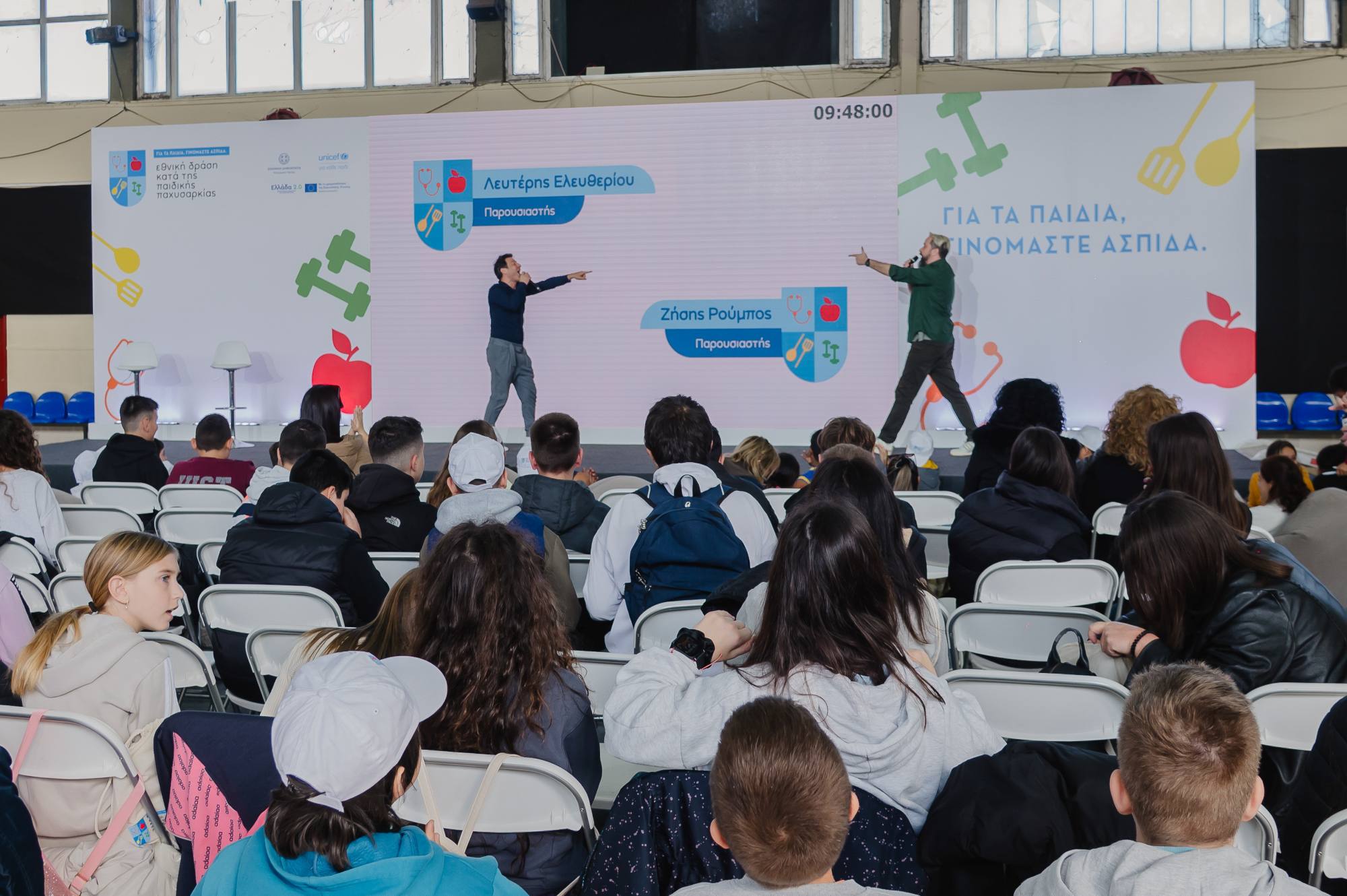 Τους μαθητές υποδέχτηκαν ο Λευτέρης Ελευθερίου και ο Ζήσης Ρούμπος παρουσιάζοντας την Εθνική Δράση κατά της Παιδικής Παχυσαρκίας, ενώ σεφ Τάσος Αντωνίου ετοίμασε μαζί με τα παιδιά γευστικές και υγιεινές συνταγές. Παράλληλα, ο διαιτολόγος- διατροφολόγος Βάιος Σβώλος μοιράστηκε έξυπνες συμβουλές για μια πιο ισορροπημένη διατροφή.