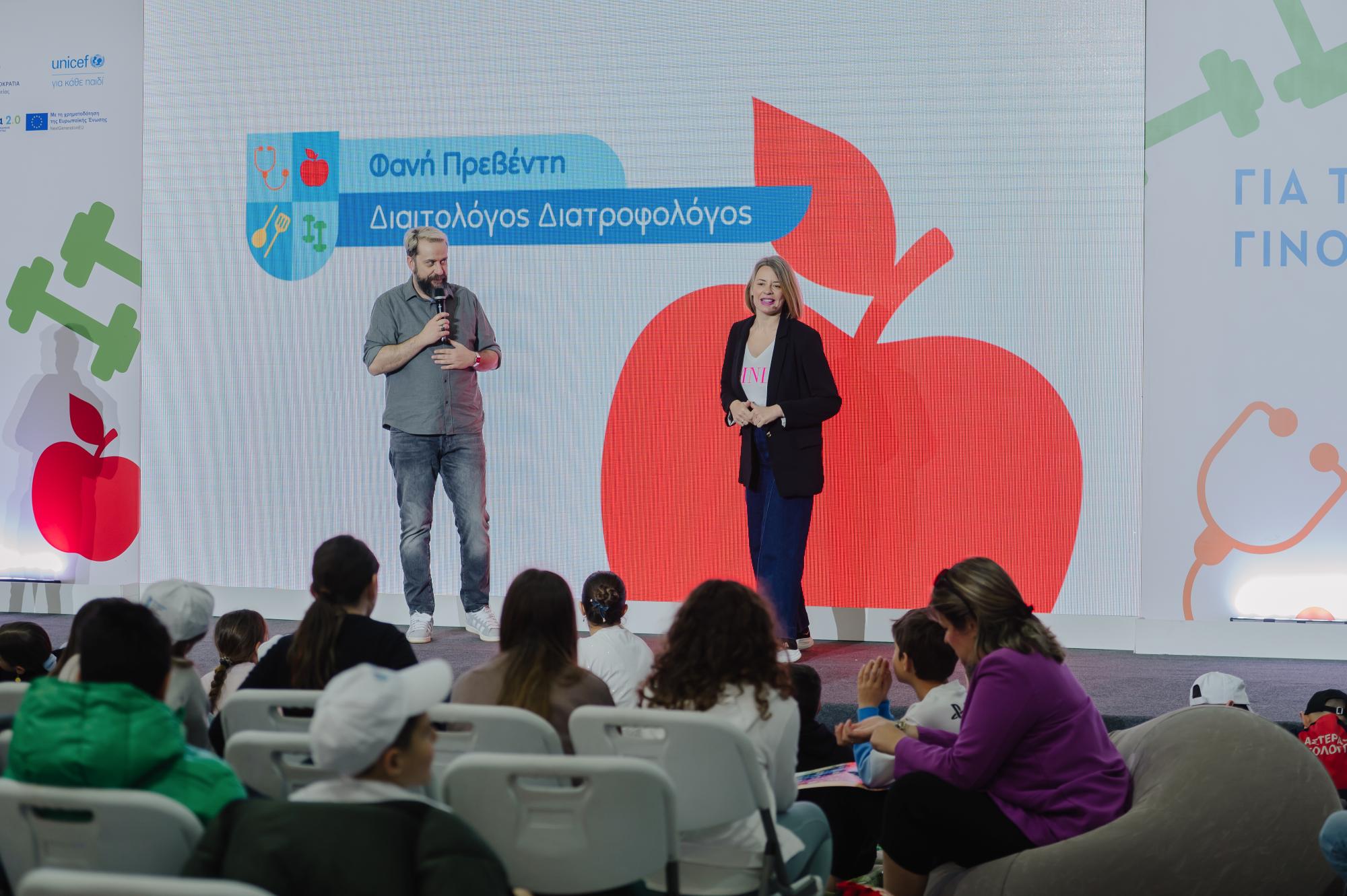 Τους μαθητές υποδέχτηκε ο Λευτέρης Ελευθερίου παρουσιάζοντας την Εθνική Δράση κατά της Παιδικής Παχυσαρκίας, ενώ σεφ τον Γιώργο Τσούλη ετοίμασε μαζί με τα παιδιά γευστικές και υγιεινές συνταγές. Παράλληλα, η διαιτολόγος- διατροφολόγος Φανή Πρεβέντη μοιράστηκε έξυπνες συμβουλές για μια πιο ισορροπημένη διατροφή.