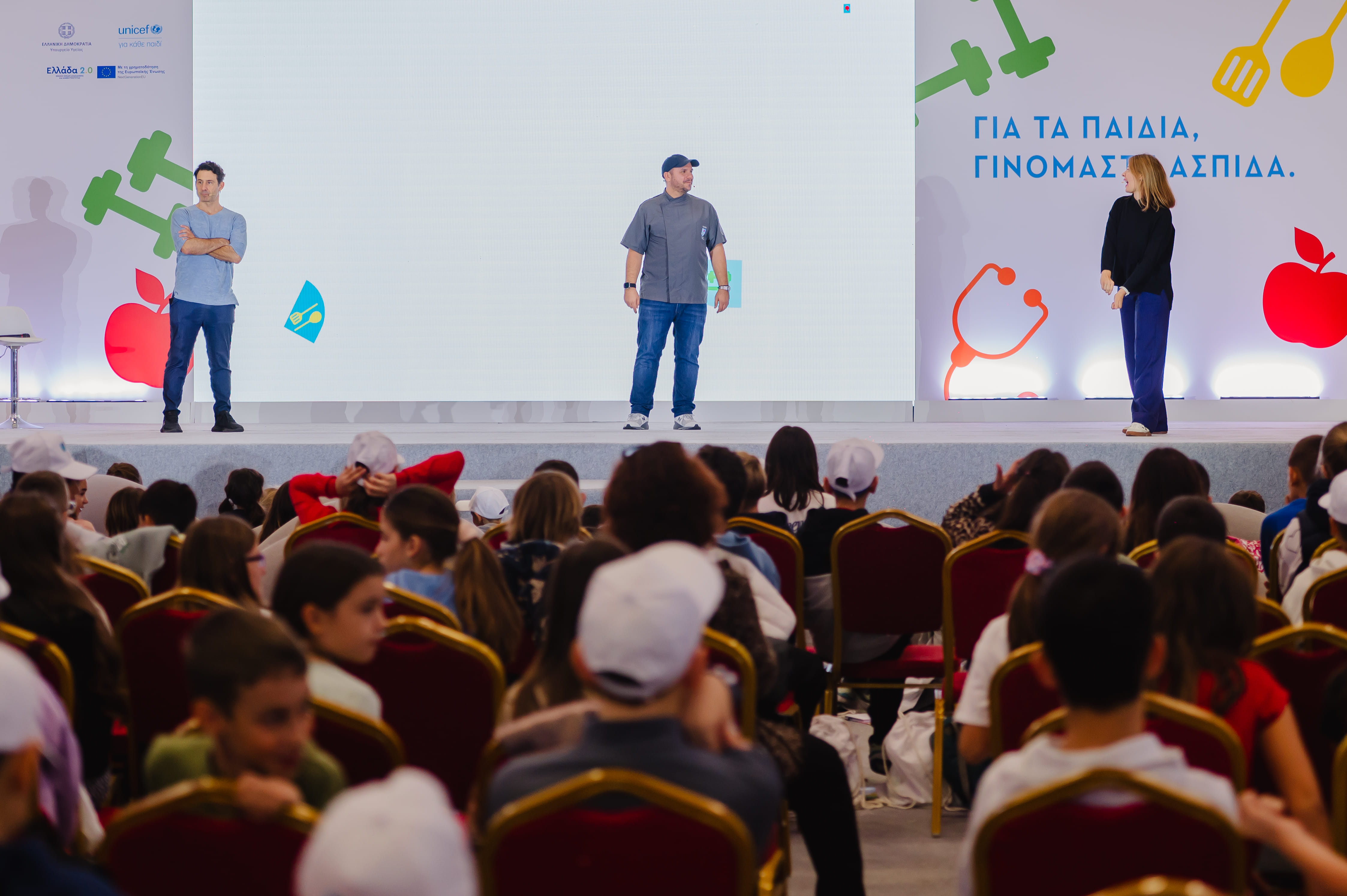 Τους μαθητές υποδέχτηκαν ο Λευτέρης Ελευθερίου παρουσιάζοντας την Εθνική Δράση κατά της Παιδικής Παχυσαρκίας, ενώ ο σεφ Τάσος Αντωνίου ετοίμασε μαζί με τα παιδιά γευστικές και υγιεινές συνταγές.